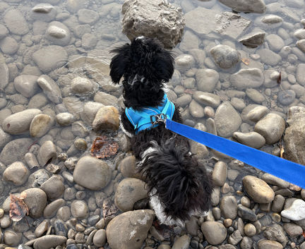 She is a sweetheart! Very loving, gentle and sensitive. Loves affection and attention and will make a family so happy to have her in their lives. She is always so cheerful, tail wagging constantly and is quiet and content just being beside her person/people. Always up for any adventure and gets the zoomies in the snow. Enjoys saying hello to small dogs and chases birds. Fully house trained and has never had an accident. Will go to the door to alert she has to go outside. Sleeps throughout the night in my bed and waits politely for me to wake up by staring at me. Loves to cuddle with my husband on the couch and help him make dinner. She is often at our feet and we are training her to sit away so not to step on her or trip. She is doing well learning not to beg for food and has learned to now sit in her bed till we are done dinner. She a deep sleeper and has fun doggy dreams, barks, yelps and runs miles in her sleep!